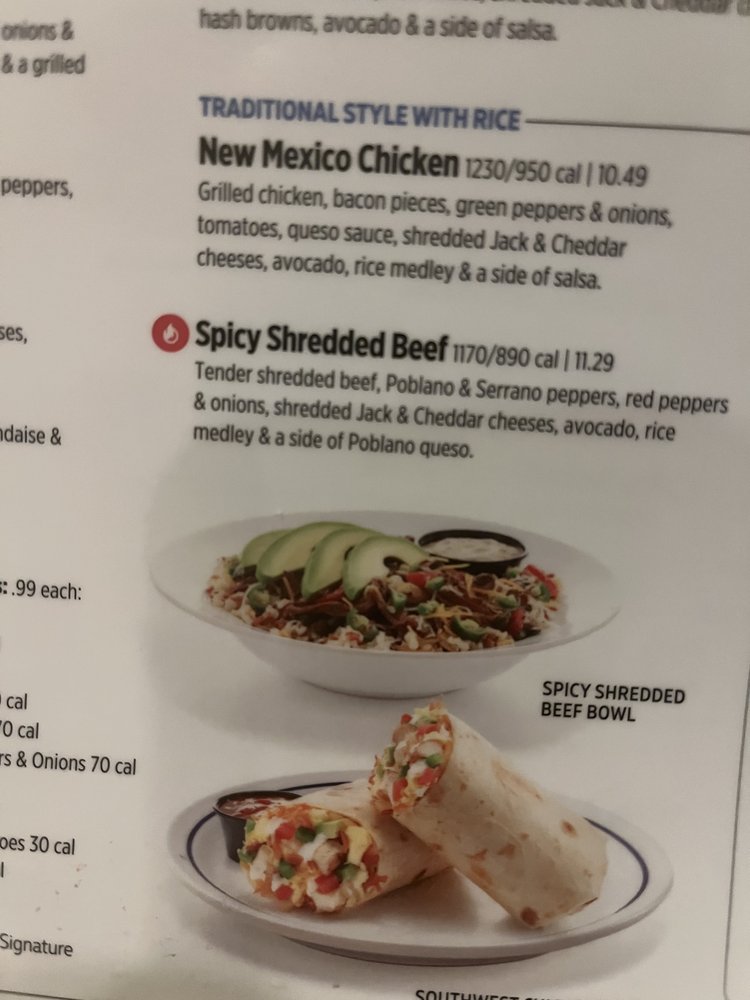 3 slices of hickory-smoked bacon, 3 pork sausage links, hash browns, scrambled eggs, jack & cheddar cheeses, and hollandaise wrapped and griddled in a tortilla.